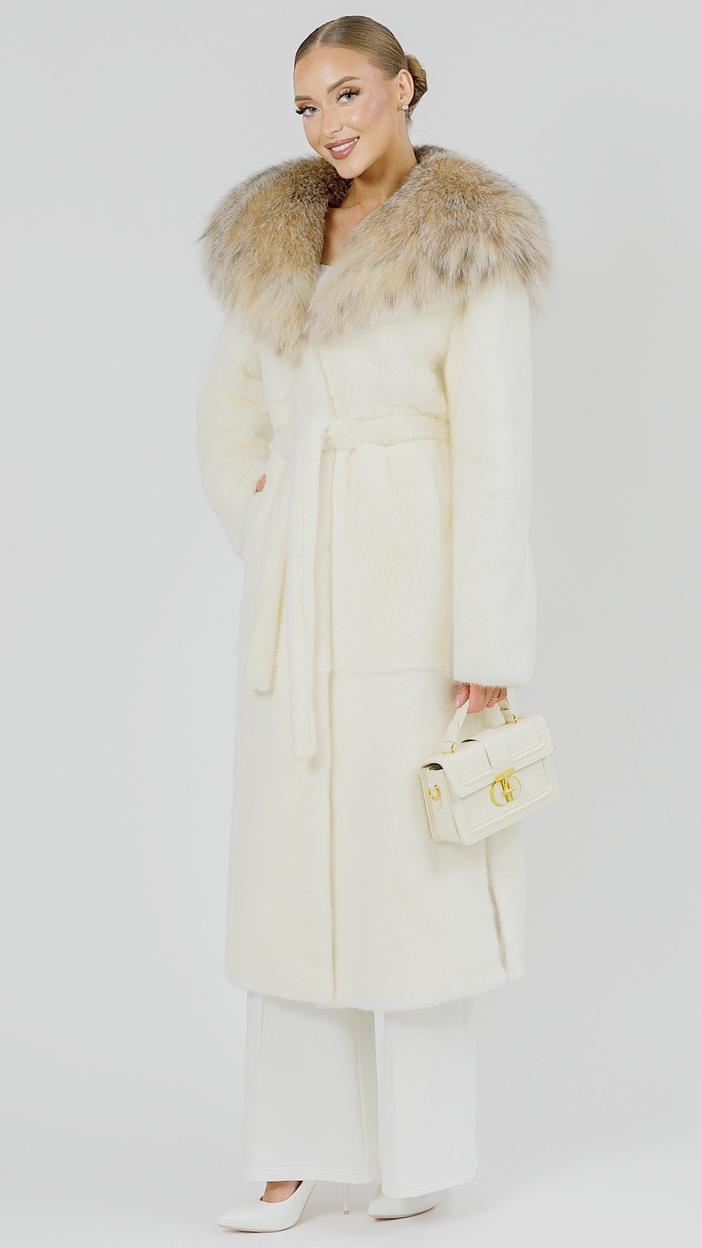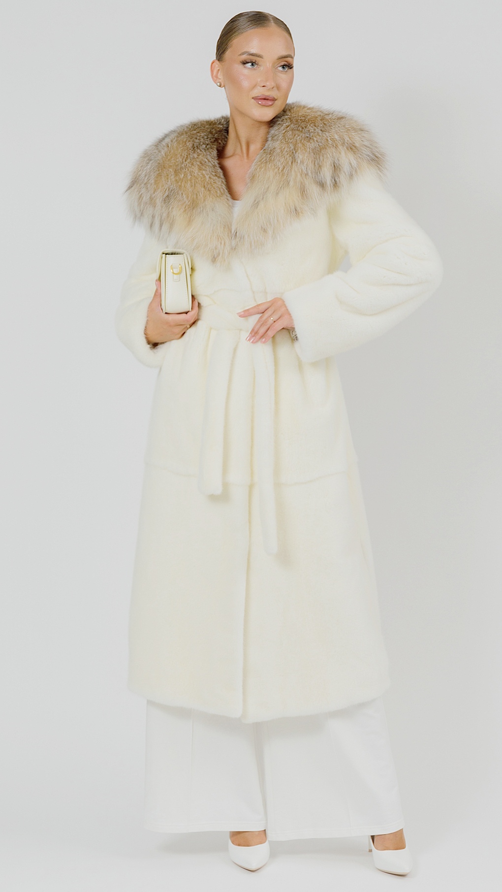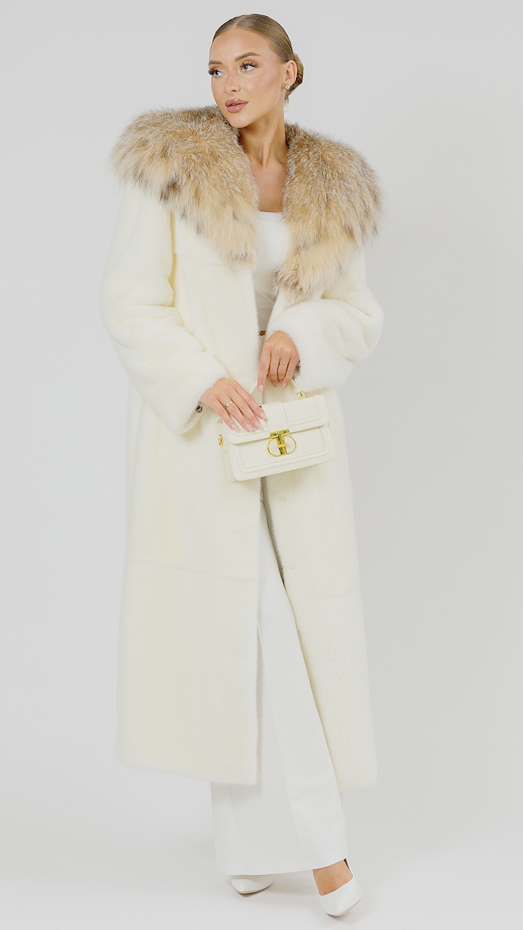 Шуба maxi из белой норки с капюшоном из меха рыси