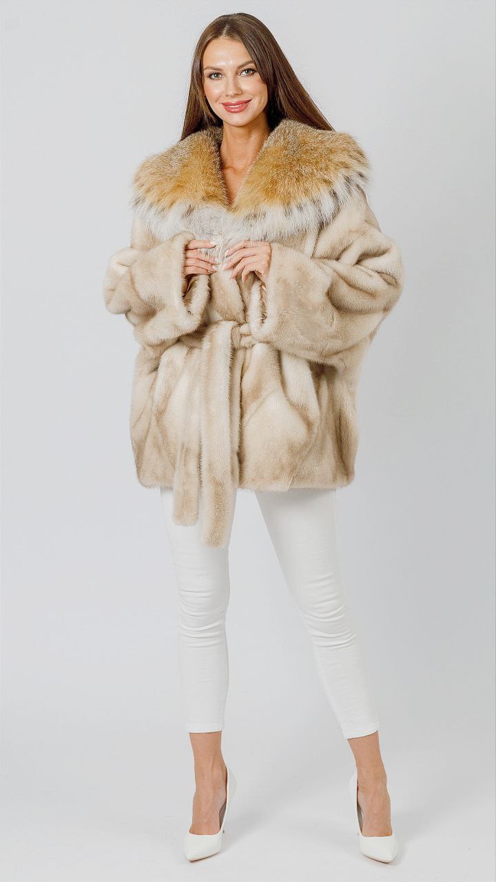 Полушубок из палевой норки с капюшоном из меха рыси 2884